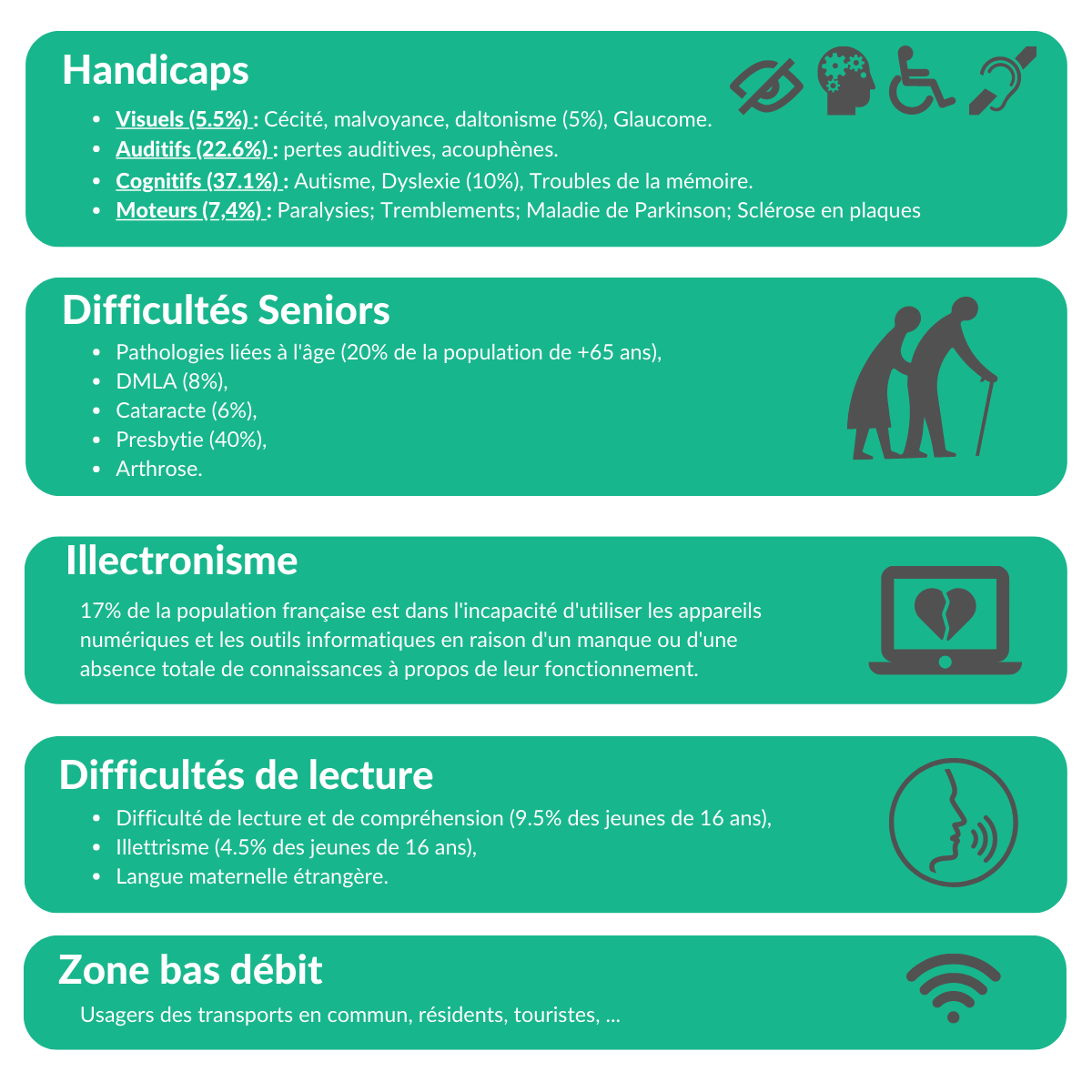 L’OMS rapporte que 9,6 millions de Français sont concernés par l'inaccessibilité numérique du fait de handicaps (cognitifs, visuels, moteurs …). S’y ajoutent les difficultés dues à l'inexpérience numérique, au vieillissement, aux problèmes de langages (illettrisme, langue maternelle étrangère), aux zones à faible débit réseau…