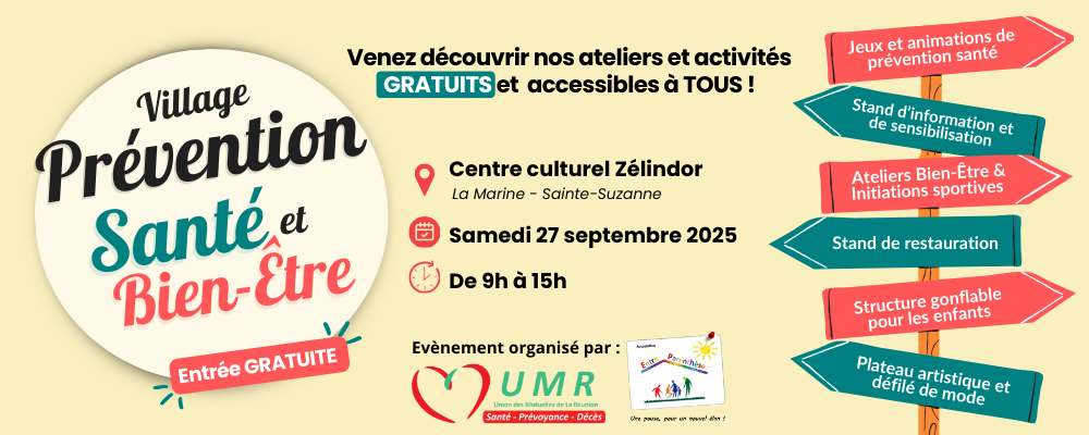 L’UMR, et son partenaire l’association Entre Parenthèses, organisent un Village Prévention Santé & Bien-Être le samedi 27 septembre 2025 au Centre Culturel Zélindor à La Marine, Sainte-Suzanne.